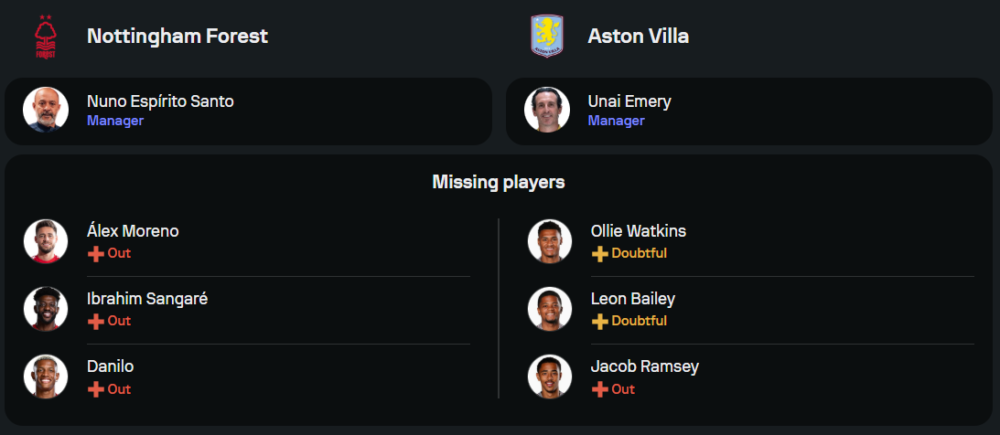 ฝั่งแอสตัน วิลล่า ของ อูไน เอเมรี่ เพิ่งกลับมาจากศึกหนักในยูฟ่า แชมเปี้ยนส์ ลีก ที่บุกเอาชนะไลป์ซิก 3-2 โดยมีเวลาพักฟื้นไม่มาก แต่พวกเขายังมีตัวหลักพร้อมลงสนามเกือบครบชุด ยกเว้น จาค็อบ แรมซี่ย์ ที่ยังพักฟื้น โดยแนวรุกนำทัพโดย โอลลี่ วัตกิ้นส์, แม็ตธิว แคช และ จอห์น แม็กกินน์