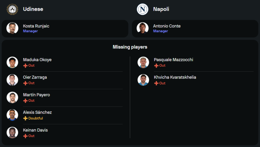ทีมเยือนฟอร์มช่วงหลังเริ่มแผ่วลงเล็กน้อย แต่ยังคงมีขุมกำลังที่น่ากลัว แม้ว่าจะขาด ควิช่า ควารัตสเคเลีย ที่เจ็บเข่า และ ปาสกวาเล่ มาซซ็อคคี่ ในแนวรับ แต่ยังได้ โรเมลู ลูกากู และ มัตเตโอ โปลิตาโน่ ลงล่าตาข่ายในระบบ 4-3-3 พร้อมด้วย สก็อตต์ แม็คโทมิเนย์ คอยคุมเกมในแดนกลาง