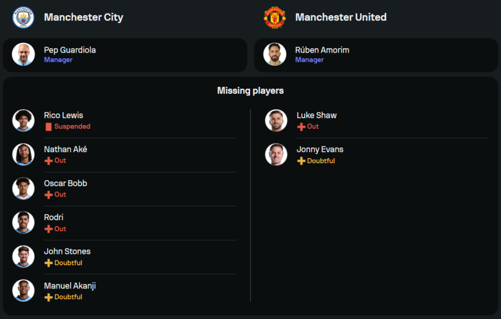 รูเบน อาโมริม มีข่าวดีเมื่อไม่มีผู้เล่นบาดเจ็บเพิ่มเติม นอกเสียจาก ลุค ชอว์ ที่ยังไม่พร้อมลงสนาม ความหวังของทีมจะอยู่ที่ ราสมุส ฮอยลุนด์ ซึ่งพร้อมประสานงานกับ บรูโน่ แฟร์นานเดส และ มาร์คัส แรชฟอร์ด เกมนี้พวกเขาตั้งเป้าหมายอย่างน้อยแชร์แต้มกลับบ้าน เพื่อรักษาขวัญกำลังใจหลังคว้าชัยเหนือ วิคตอเรีย เพิลเซ่น 2-1 ในเกมยุโรป