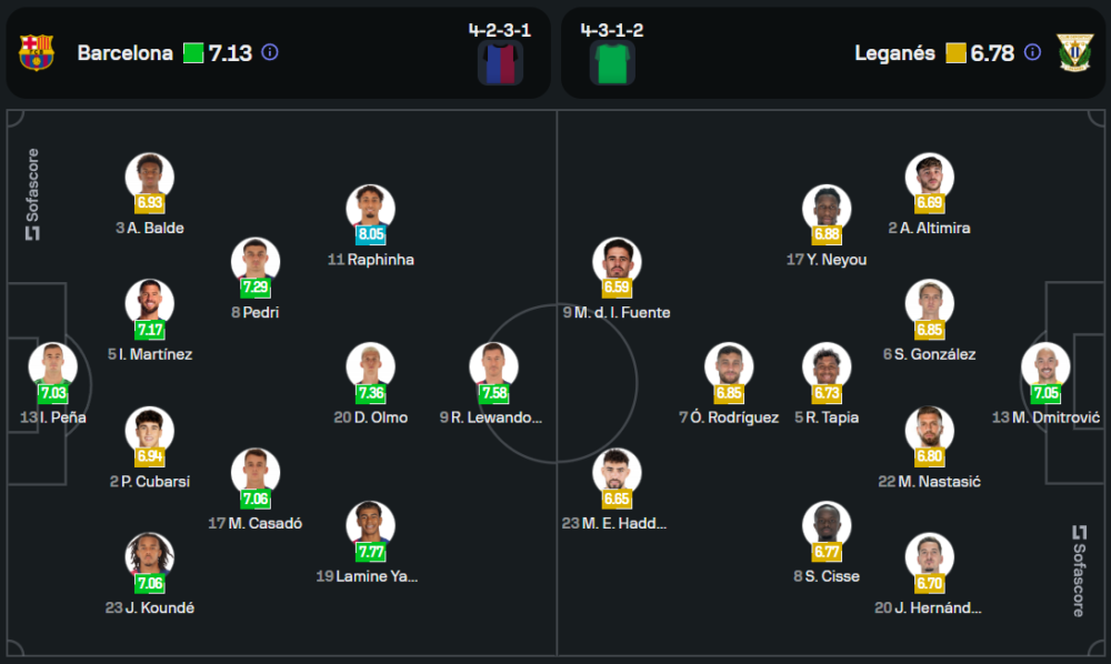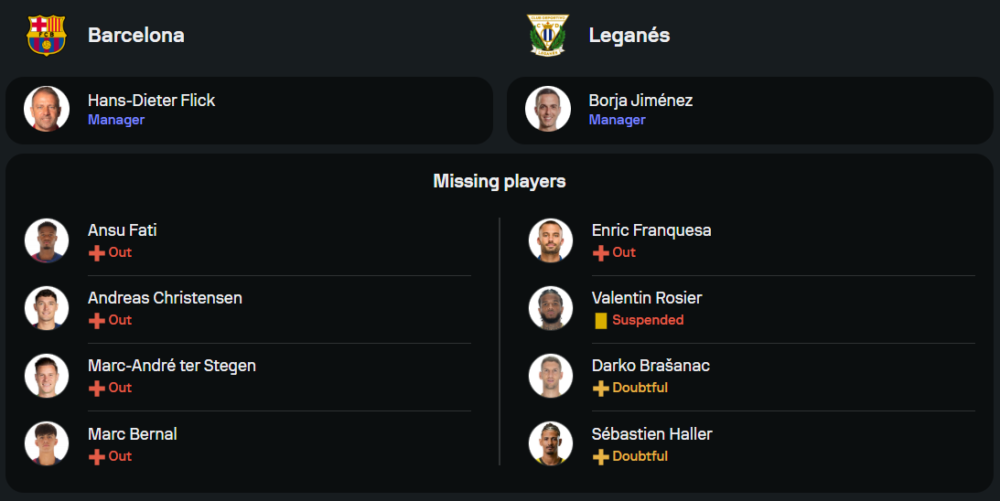 ลูกทีมของ ชาบี เอร์นานเดซ มีข่าวดีเมื่อไม่มีปัญหาผู้เล่นใหม่บาดเจ็บเพิ่ม แต่ยังขาด มาร์ก-อันเดร แตร์ สเตเก้น นายด่านตัวหลักที่บาดเจ็บ รวมถึง อันซู ฟาติ และ อันเดรียส คริสเตนเซ่น แนวรุกยังคงใช้ โรเบิร์ต เลวานดอฟสกี้ เป็นตัวความหวังร่วมกับ ลามีน ยามาล และ เฟร์ราน ตอร์เรส ในระบบ 4-2-3-1 ที่เน้นเกมรุกจัดจ้าน