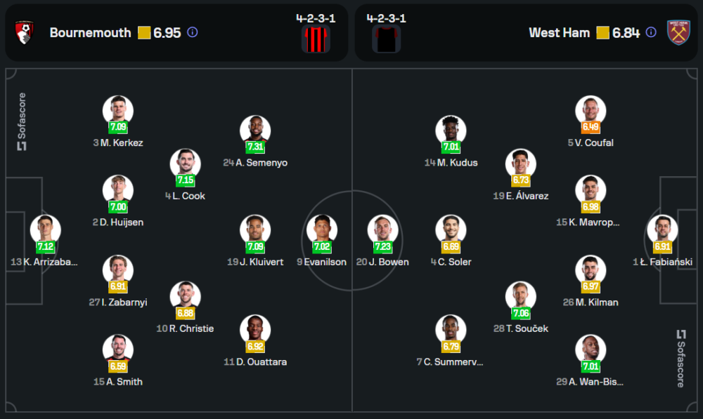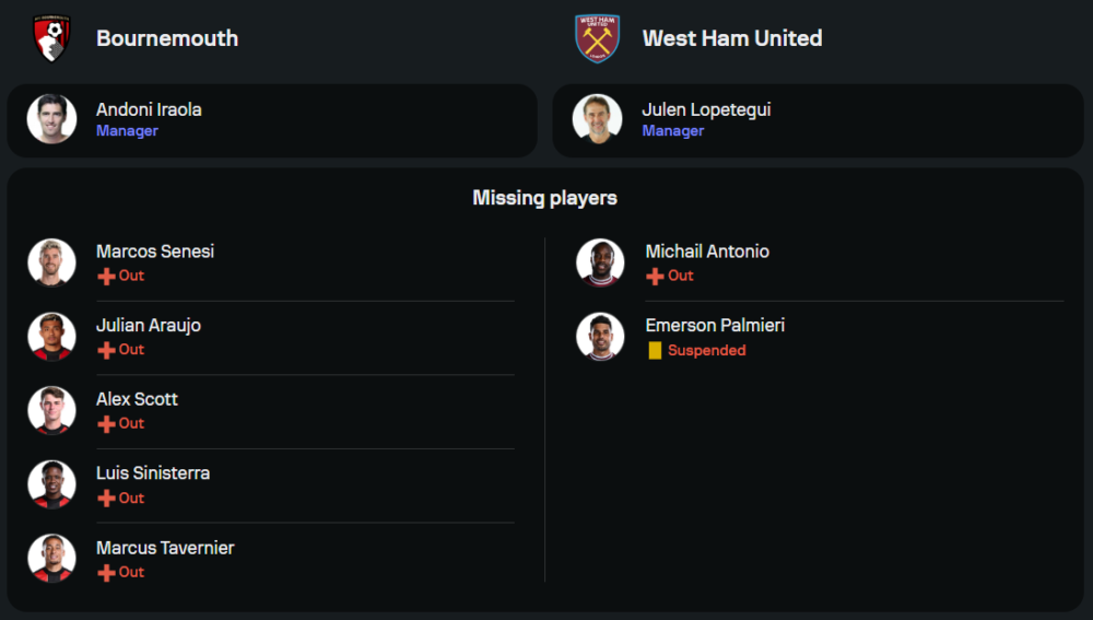 ทีมเยือนของ ฆูเลน โลเปเตกี ต้องเผชิญปัญหาผู้เล่นบาดเจ็บและติดโทษแบน โดยเฉพาะ เอแมร์สัน พัลไมรี่ และ มิคาอิล อันโตนิโอ ที่หมดสิทธิ์ช่วยทีม อย่างไรก็ตาม จาร์ร็อด โบเว่น ยังคงเป็นความหวังสำคัญในแนวรุก พร้อมการสนับสนุนจาก โมฮัมเหม็ด คูดุส และ ลูคัส ปาเกต้า โดยคืนนี้พวกเขามาในระบบ 4-2-3-1 เช่นกัน
