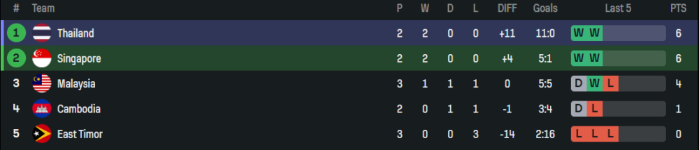 สิงคโปร์ ทีมชาติสิงคโปร์ รั้งอันดับที่ 2 ของกลุ่มเอ มี 6 คะแนนเต็มจากการลงเล่น 2 นัด โดยเกมล่าสุดโชว์ฟอร์มแกร่งเอาชนะ ติมอร์-เลสเต ไปแบบขาดลอย 3-0 แถมยังรักษาคลีนชีตได้ทั้งสองเกม ฟอร์มการเล่นที่คงเส้นคงวาและเกมรุกที่เฉียบคมถือเป็นจุดแข็งที่น่าจับตามอง