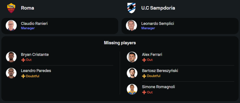 ย้อนดูสถิติการเจอกันที่ผ่านมา ต้องบอกว่า เอเอส โรม่า ข่มทีมเยือนอย่างเห็นได้ชัด โดยพวกเขาคว้าชัยไปได้ถึง 7 ครั้งจาก 10 นัดหลังสุด ส่วน ซามพ์โดเรีย เก็บชัยได้เพียงครั้งเดียวเท่านั้น นอกจากนี้ โรม่า ยังเคยเปิดบ้านถล่ม ซามพ์โดเรีย ไปถึง 3-0 ในเกมล่าสุดเมื่อเดือนเมษายนที่ผ่านมา อย่างไรก็ตามในเกมบอลถ้วยทุกอย่างเกิดขึ้นได้ หากประมาทเพียงนิดเดียวอาจโดนทีเด็ดบอลจากทีมเยือนสวนกลับได้เหมือนกัน
