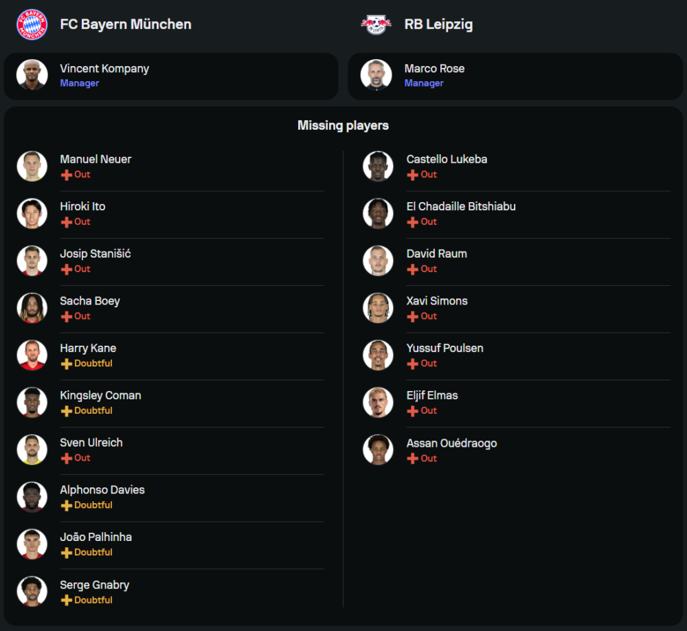 ลูกทีมของ แว็งซ็อง ก็อมปานี ต้องเผชิญความกดดันหลังพ่ายแพ้ในเกมล่าสุด ความพร้อมของทีมยังคงมีปัญหากับอาการบาดเจ็บของนักเตะหลักหลายราย เช่น มานูเอล นอยเออร์ และ แฮร์รี่ เคน อย่างไรก็ตาม ดาโยต์ อูปาเมกาโน่ มีลุ้นคืนสนามเป็นตัวจริงในแนวรับ ขณะที่แดนกลางนำโดย โยชัว คิมมิค และเกมรุกจะหวังพึ่ง เลรอย ซาเน่ และ ยามาล มูเซียล่า ในระบบ 4-2-3-1 ที่เน้นการครองบอลและบุกทำประตูอย่างดุดัน
