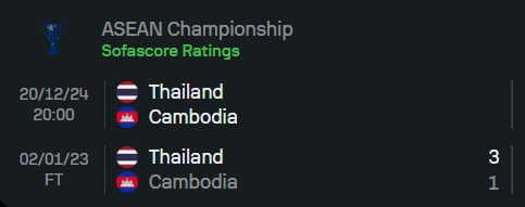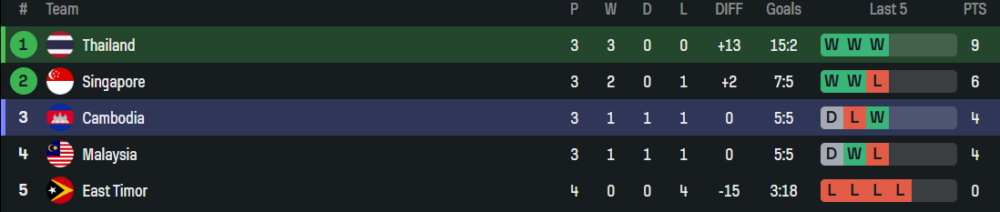 ผลงานร้อนแรงไร้พ่ายในรายการนี้ โดยชนะรวดทั้ง 3 นัดที่ผ่านมา เกมล่าสุดพลิกแซงเอาชนะสิงคโปร์ 4-2 ได้อย่างสุดมันส์ พร้อมสถิติไม่แพ้ใครติดต่อกันถึง 10 เกม - ทีมชาติกัมพูชา