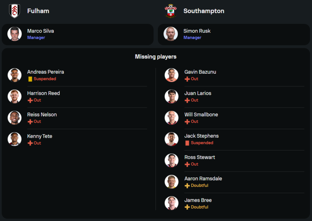 ด้านทีมเยือน เซาท์แฮมป์ตัน กำลังอยู่ในช่วงวิกฤติ ฟอร์มล่าสุดพ่ายลิเวอร์พูล 1-2 ในลีกคัพ และผลงานในพรีเมียร์ลีกก็ไม่ต่างกัน โดยเฉพาะเกมเยือนที่แพ้ถึง 7 จาก 8 นัดในซีซั่นนี้ ไซม่อน รุสค์ กุนซือรักษาการ ต้องเผชิญกับความท้าทายอย่างหนักเมื่อขาดนักเตะตัวหลักหลายราย ทั้ง แจ็ค สตีเฟ่นส์ และ ฆวน ลาริออส ทำให้เกมนี้ต้องฝากความหวังไว้ที่คู่กองหน้า ปอล โอนูอาชู และ อดัม อาร์มสตรอง