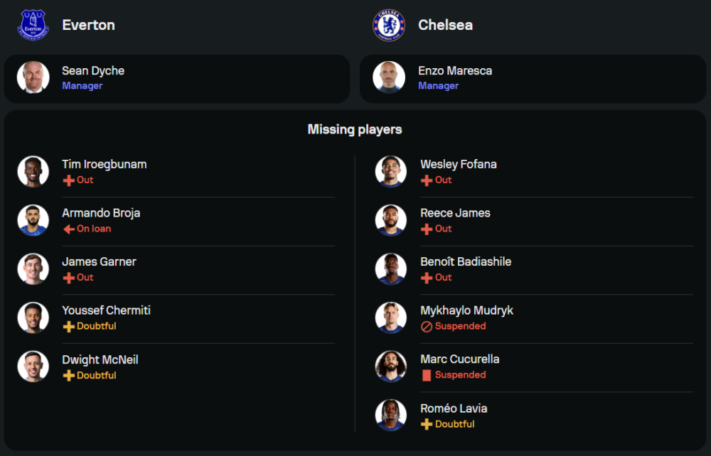 ทีมเจ้าบ้านภายใต้การนำของ ฌอน ไดช์ เพิ่งโชว์ความเหนียวแน่นในเกมล่าสุดด้วยการบุกไปแบ่งแต้มจากอาร์เซน่อลแบบไร้สกอร์ แต่สำหรับเกมนี้พวกเขาต้องขาดผู้เล่นสำคัญอย่าง อาร์มันโด้ โบรย่า ที่ติดสัญญายืมตัวจากเชลซี รวมถึงแข้งบาดเจ็บอย่าง เจมส์ การ์เนอร์ และ ยูสเซฟ เชอร์มิตี้ ทำให้เกมรุกต้องฝากความหวังไว้ที่ โดมินิก คัลเวิร์ต-เลวิน และ อับดูลาย ดูกูเร่ ที่จะต้องสร้างความกดดันให้แนวรับของเชลซี