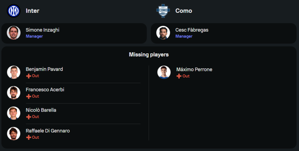 โคโม่: เชสก์ ฟาเบรกัส กุนซือของโคโม เพิ่งปลดล็อกชัยชนะเหนือ โรม่า 2-0 ในเกมล่าสุด แต่ยังมีจุดอ่อนสำคัญในเกมเยือนที่ไม่ชนะใครมา 5 นัดติด สภาพทีมยังต้องไร้ อัลเบร์โต้ โมเรโน่ และ มักซิโม แปร์โรเน่ แต่ยังมีตัวสร้างเกมอย่าง กาเบรียล สเตรเฟซซ่า และ อันเดรีย เบล็อตติ ที่หวังพาทีมลุ้นแต้มในเกมนี้