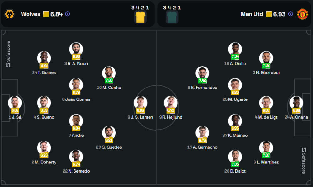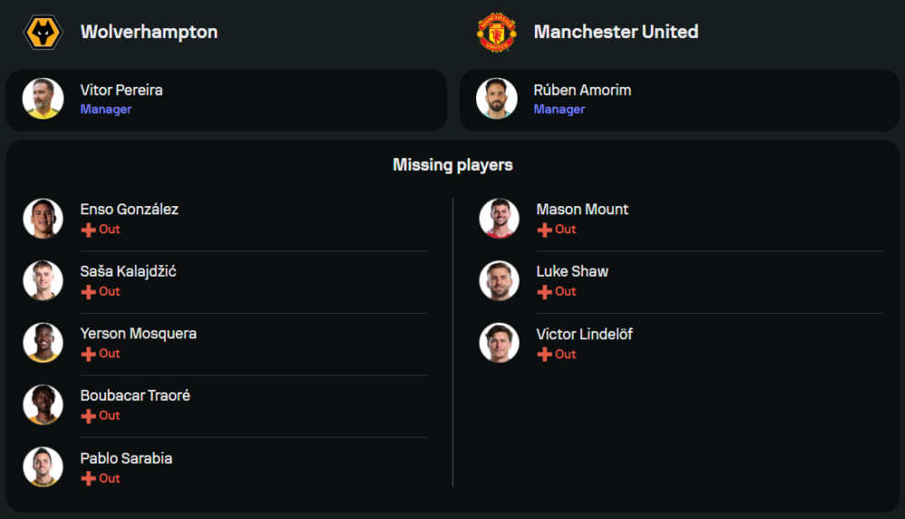 ทีมเยือนปีศาจแดงของ รูเบน อาโมริม ยังคงมีปัญหาเรื่องความพร้อม โดยขาดนักเตะตัวหลักอย่าง ลุค ชอว์, วิคตอร์ ลินเดอเลิฟ และ เมสัน เม้าท์ ที่ยังบาดเจ็บ รวมถึงการต้องปรับเกมรับให้มั่นคงขึ้น หลังจากเสียประตูไปถึง 4 ลูกใน 2 นัดล่าสุด ขณะที่เกมนี้คาดว่า ราสมุส ฮอยลุนด์ จะได้ลงสนามในตำแหน่งหน้าเป้า โดยมี บรูโน่ แฟร์นานเดส และ อาหมัด ดิยัลโล่ คอยสนับสนุนในเกมรุกในระบบ 3-4-2-1 เช่นกัน