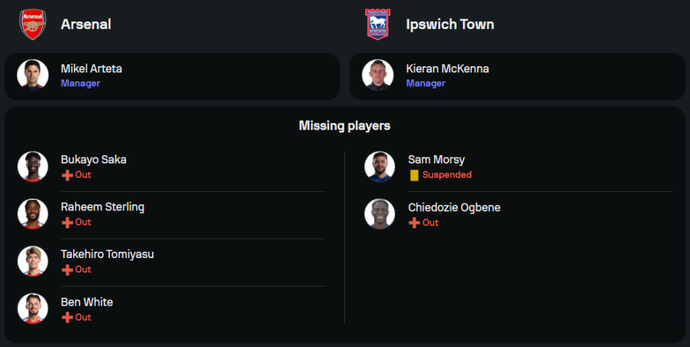 ด้าน คีแรน แม็กเคนน่า กุนซืออิปสวิช ต้องเผชิญปัญหานักเตะบาดเจ็บหลายราย รวมถึง แซม มอร์ซี่ กองกลางตัวหลักที่ติดโทษแบน ขณะที่ผู้เล่นที่เหลืออย่าง เลียม ดีแล็ป, คอเนอร์ แช็ปลิน และ ซามูเอล ซีโมดิกส์ พร้อมลงสนามในระบบ 4-2-3-1 เกมนี้พวกเขาต้องการแต้มอย่างยิ่งเพื่อกู้สถานการณ์ในลีก