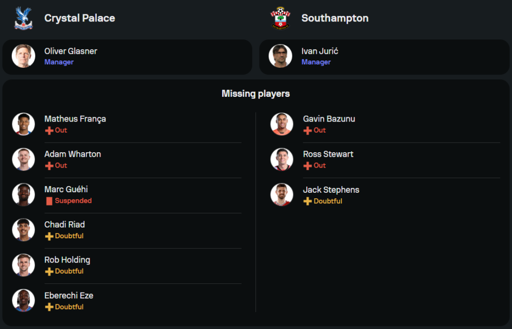 ทีมของกุนซือ โอลิเวอร์ กลาสเนอร์ เพิ่งบุกเสมอ บอร์นมัธ 0-0 ในเกมล่าสุด แต่ความพร้อมของทีมยังคงมีปัญหาเรื่องตัวผู้เล่น โดยเฉพาะ มาร์ก กูเอฮิ ที่ติดโทษแบน เช่นเดียวกับผู้เล่นบาดเจ็บอย่าง อดัม วาร์ตัน, มาเธอุส ฟรังช่า และ ฟรังโก้ อูเมห์-ชิบูเอเซ่ การจัดทีมคาดว่าจะมาในระบบ 3-4-2-1 โดย ฌ็อง-ฟิลิปเป้ มาเตต้า เป็นหน้าเป้า และได้การสนับสนุนจาก อิสไมล่า ซาร์ และ เอเบเรชี่ เอเซ่
