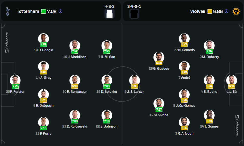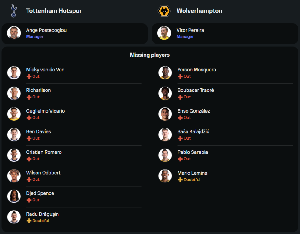 ลูกทีมของ อังเก้ ปอสเตโคกลู เพิ่งพ่ายให้กับฟอเรสต์ในเกมล่าสุด 0-1 และยังต้องเผชิญกับปัญหาผู้เล่นบาดเจ็บหลายราย ไม่ว่าจะเป็น มิคกี้ ฟาน เด เฟ่น, ริชาร์ลิซอน, กูเญลโม่ วิคาริโอ้ และ คริสเตียน โรเมโร่ ขณะที่ เฌด สเปนซ์ ต้องติดโทษแบนเพิ่มเติม อย่างไรก็ตาม ปอสเตโคกลูยังคงวางใจใช้ระบบ 4-3-3 โดยมี ซอน ฮึง-มิน, เบรนแน่น จอห์นสัน และ โดมินิก โซลันกี้ ลงล่าสกอร์ในแนวรุก