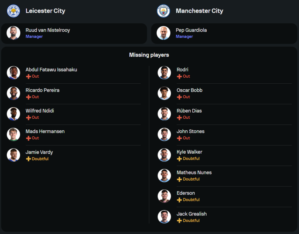 ทีมของ รุด ฟาน นิสเตลรอย เพิ่งบุกไปพ่าย ลิเวอร์พูล 1-3 ในเกมล่าสุด ความพร้อมของทีมยังคงมีปัญหาเรื่องอาการบาดเจ็บของผู้เล่นสำคัญอย่าง วิลเฟร็ด เอ็นดิดี้, ริคาร์โด้ เปไรร่า และ แม็ดส์ เฮอร์มันเซ่น อย่างไรก็ตาม ทีมยังพอหวังพึ่งฟอร์มของแนวรุกอย่าง แพ็ตสัน ดาก้า ที่จะนำทีมล่าตาข่ายในระบบ 4-2-3-1 โดยมี จอร์แดน อายิว, ฟากุนโด บูโอนาน็อตเต้ และ สเตฟี่ มาวิดิดี้ เป็นสามประสานช่วยสร้างเกมรุก