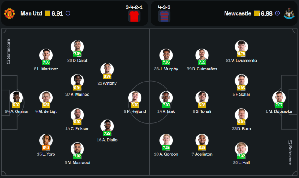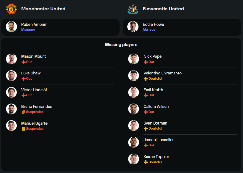 เจ้าบ้านยังคงเผชิญปัญหาผู้เล่นบาดเจ็บและติดโทษแบนหลายราย รวมถึง บรูโน่ แฟร์นันเดส และ มานูเอล อูการ์เต้ ที่พลาดเกมนี้เนื่องจากโทษแบน ขณะที่ตัวหลักอย่าง ลุค ชอว์, วิคตอร์ ลินเดอเลิฟ และ เมสัน เม้าท์ ยังคงอยู่ในลิสต์ผู้เล่นบาดเจ็บ แต่ อันโตนี่ และ อาหมัด ดิยัลโล่ จะได้โอกาสลงสนามในเกมรุก พร้อมด้วย ราสมุส ฮอยลุนด์ ที่จะเป็นตัวจบสกอร์