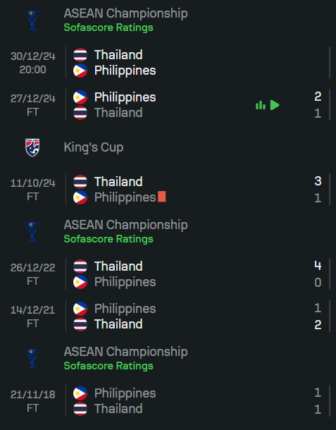 จาก 5 นัดหลังสุด ไทยถือว่าเหนือกว่า โดยเอาชนะฟิลิปปินส์ได้ถึง 3 ครั้ง เสมอ 1 และแพ้เพียงครั้งเดียว ซึ่งเกิดขึ้นในนัดล่าสุดที่ฟิลิปปินส์เปิดบ้านชนะไทย 2-1 ในเกมแรกของรอบนี้ อย่างไรก็ตาม ทีเด็ดบอล ของช้างศึกยังคงอยู่ที่การเล่นในบ้านซึ่งพวกเขามักทำผลงานได้ดี และจะเป็นโอกาสที่สำคัญในการแก้แค้นครั้งนี้