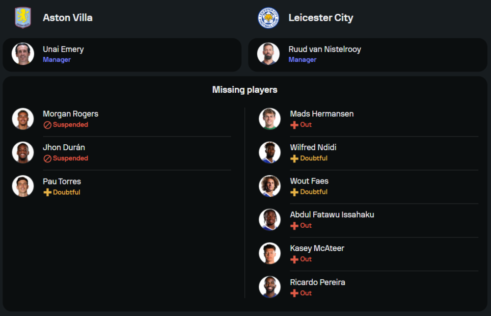 แอสตัน วิลล่า เจ้าบ้าน แอสตัน วิลล่า ภายใต้การนำของ อูไน เอเมรี่ นัดล่าสุดเปิดบ้านเจ๊ากับไบรท์ตัน 2-2 แต่เกมนี้พวกเขาจะไม่มี จอห์น ดูราน และ มอร์แกน โรเจอร์ส สองกองหน้าตัวเก่งที่ติดโทษแบน ขณะเดียวกัน ปาอู ตอร์เรส เซ็นเตอร์แบ็กคนสำคัญยังไม่ฟิตพอ คาดว่า เอเมรี่ จะส่ง โอลลี่ วัตกิ้นส์ ลงล่าตาข่ายร่วมกับ จอห์น แม็กกินน์ และ จาค็อบ แรมซี่ย์ ในระบบ 4-3-3 โดยพวกเขายังคงพึ่งพาพลังงานจากเกมในบ้านที่แข็งแกร่ง