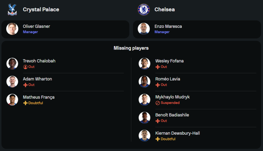 ทีมเยือน เชลซี ภายใต้การคุมทีมของ วินเซนโซ่ มาเรสก้า เพิ่งจะพ่ายให้กับ อิปสวิช 0-2 ในเกมล่าสุด ทำให้พวกเขาต้องเร่งกลับมาสู่ฟอร์มเดิมโดยเร็ว ความพร้อมของทีมยังคงมีผู้เล่นเจ็บสำคัญ เช่น เวสลี่ย์ โฟฟาน่า และ มีไคโล มูดริค ที่ติดโทษแบน แต่ตัวรุกอย่าง โคล พัลเมอร์ และ นิโคลัส แจ็คสัน ยังพร้อมนำทัพในแผน 4-2-3-1