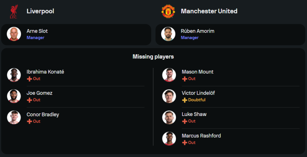 ฝั่งทีมเยือนของ รูเบน อาโมริม เพิ่งพ่ายคาบ้านให้นิวคาสเซิ่ล 0-2 ฟอร์มโดยรวมยังไม่เข้าที่ ขณะที่ตัวหลักอย่าง ลุค ชอว์, วิกตอร์ ลินเดอเลิฟ และ เมสัน เม้าต์ ยังคงไม่พร้อมลงสนาม คาดว่าจะใช้ระบบ 3-4-2-1 โดยมี ราสมุส ฮอยลุนด์ เป็นหัวหอกตัวเป้า และให้ บรูโน่ แฟร์นานเดส กับ อเลฮานโดร การ์นาโช่ ช่วยสร้างเกมบุก