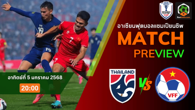 ค่ำคืนที่แฟนบอลทั่วทั้งอาเซียนรอคอยกำลังจะมาถึงอีกครั้ง เมื่อทัพ ช้างศึก ทีมชาติไทย ต้องเปิดสนามราชมังคลากีฬาสถาน รับการมาเยือนของคู่ปรับตลอดกาลอย่าง ดาวทอง เวียดนาม ในศึก ฟุตบอลชิงแชมป์อาเซียน 2024 รอบชิงชนะเลิศเลกสอง ที่ความมันส์และดราม่าจะปะทุอย่างแน่นอน การแข่งขันในวันอาทิตย์ที่ 5 มกราคม 2568 เวลา 20.00 น. ถือเป็นนัดที่เดิมพันด้วยศักดิ์ศรีและโอกาสคว้าถ้วยแชมป์อันยิ่งใหญ่