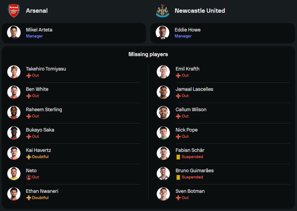 ทางฝั่งทีมเยือน นิวคาสเซิ่ล ต้องเจอปัญหาใหญ่เมื่อ ฟาเบียน ชาร์ และ บรูโน่ กิมาไรส์ ติดโทษแบน นอกจากนี้ยังขาดผู้เล่นคนสำคัญหลายคน เช่น จามาล ลาสเซลล์ส และ นิค โป๊ป อย่างไรก็ตาม แผนของ เอ็ดดี้ ฮาว ยังดูแข็งแกร่ง โดยมี อเล็กซานเดอร์ อิซัค และ แอนโธนี่ กอร์ดอน เป็นตัวทีเด็ดในแนวรุก