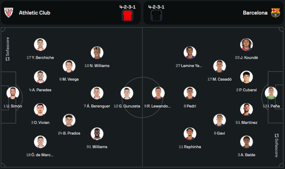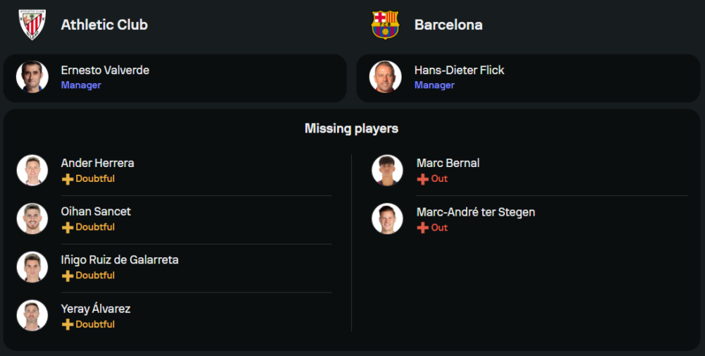 ทีมเจ้าบ้านยังคงมีปัญหาผู้เล่นบาดเจ็บ โดยเฉพาะ เยราย อัลบาเรซ และ โอยาน ซานเซต ที่หมดสิทธิ์ลงสนาม ส่วนผู้เล่นตัวหลักยังพร้อมลุยในระบบ 4-3-3 โดยมี อินญากี้ วิลเลี่ยมส์ และ นิโก้ วิลเลี่ยมส์ เป็นแกนหลักในแนวรุก