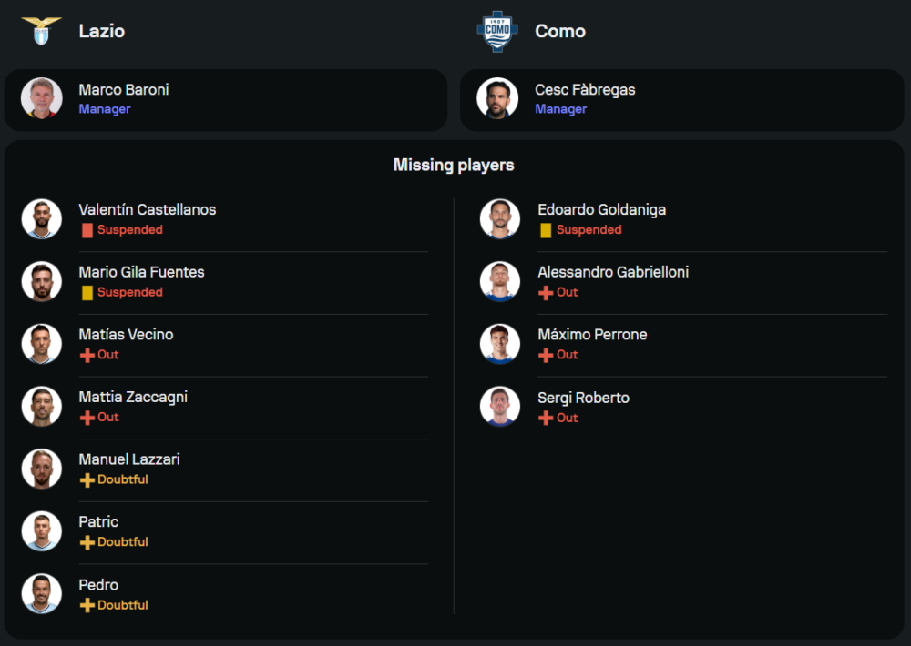 ทัพ “อินทรีฟ้าขาว” ของ มาร์โก บาโรนี่ กำลังเผชิญปัญหาผู้เล่นสำคัญติดโทษแบนถึง 3 ราย ได้แก่ วาเลนติน กาสเตยานอส, มาริโอ จีล่า, และ มัตเตีย ซัคคานญี่ ที่ต่างเป็นกำลังหลักของทีม อย่างไรก็ตาม ข่าวดีคือการกลับมาของ ทิยานนี่ นอสลิน และ เปโดร ที่ช่วยเสริมความแข็งแกร่งในแนวรุก เกมนี้คาดว่าพวกเขาจะใช้ระบบ 4-2-3-1 โดยมี บูลาย เดีย เป็นตัวความหวังในแดนหน้า