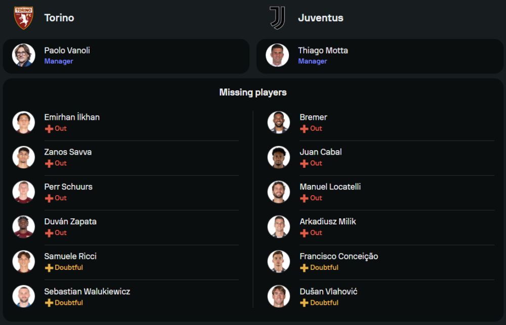 ด้านทีมเยือนของ ติอาโก้ ม็อตต้า ก็เจอปัญหาไม่น้อย เนื่องจากตัวหลักอย่าง มานูเอล โลคาเตลลี่ ติดโทษแบนจากการสะสมใบเหลืองครบ และยังมีผู้เล่นบาดเจ็บหลายราย เช่น เบรเมร์ และ ฟรานซิสโก้ คอนไซเซา อย่างไรก็ตาม ข่าวดีคือ ดูซาน วลาโฮวิช น่าจะฟิตทันลงสนามในฐานะหัวหอกตัวหลัก โดยมี นิโคลัส กอนซาเลซ และ ซามูเอล เอ็มบังกูลา คอยสนับสนุนในระบบ 4-2-3-1