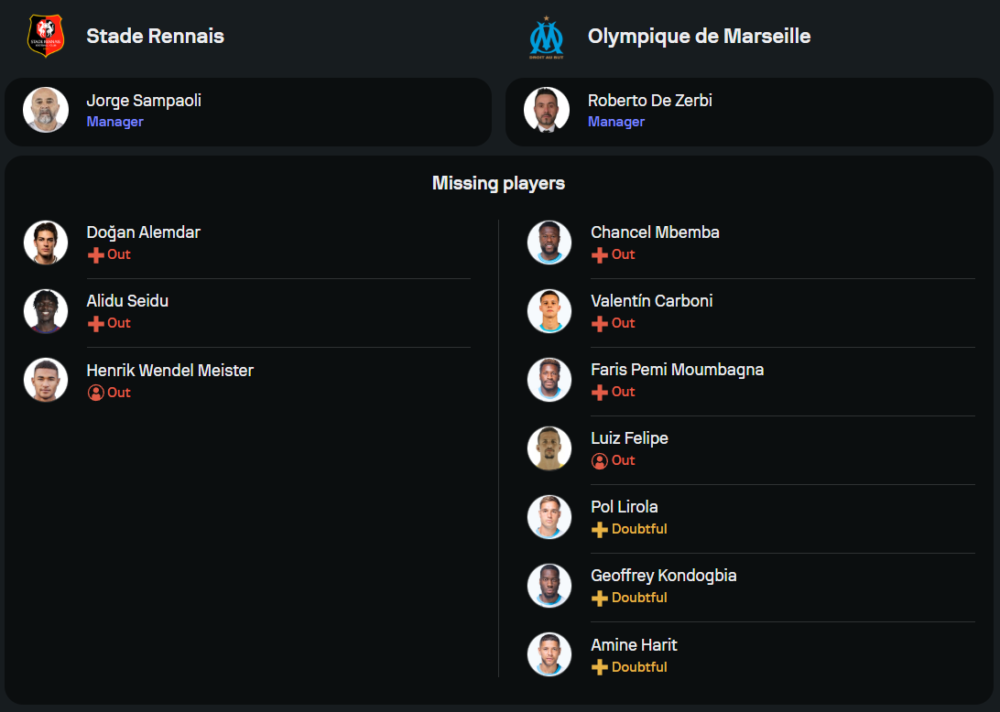 ทีมเยือนมีปัญหาในแดนหลังเช่นกัน โดย ชานแซล เอ็มเบมบา และ โปล ลิโรล่า ยังต้องพักรักษาตัว ส่วนแกนหลักอย่าง ปิแอร์ ฮอยเบียร์ กลับมาฟิตสมบูรณ์พร้อมช่วยทีม เกมรุกยังมี เมสัน กรีนวู้ด ที่ฟอร์มแรง รวมถึง เนอัล โมเปย์ และ หลุยส์ เอ็นริเก้ ที่พร้อมสร้างความกดดันให้กับแนวรับของแรนส์