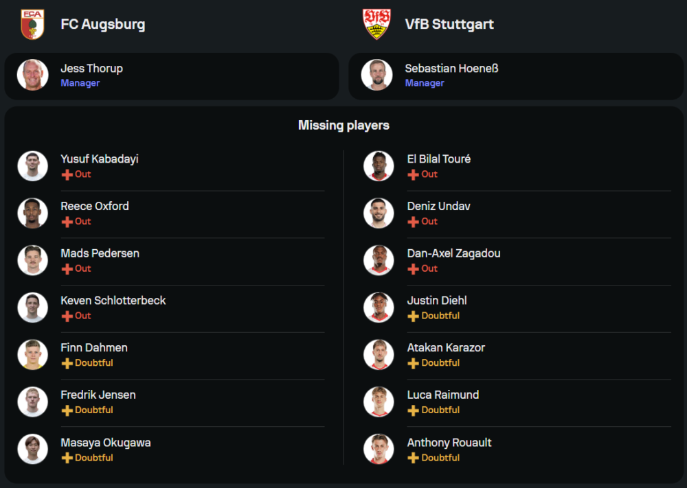 ฝั่งทีมเยือนภายใต้การคุมทีมของ เซบาสเตียน ฮูเนส แม้จะสะดุดแพ้ในเกมลีกล่าสุด แต่ก่อนหน้านั้นพวกเขาทำผลงานได้อย่างยอดเยี่ยม ชนะ 3 จาก 5 นัดหลังสุด เกมนี้พวกเขาจะได้ อตาคาน คาราซอร์ กลับมาปั้นเกมแดนกลางร่วมกับ อังเจโล่ สติลเลอร์ ส่วนแนวรุกจะปรับมาใช้ระบบหน้าคู่ โดยมี เออร์เมดิน เดมิโรวิช และ นิค วอลเทอมาเดอ ที่ทำประตูรวมกันไปแล้ว 11 ลูกในฤดูกาลนี้