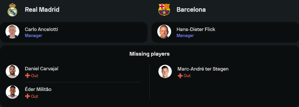 ฮานส์-ดีเทอร์ ฟลิค เฮดโค้ชของ “เจ้าบุญทุ่ม” ต้องเผชิญกับปัญหาการขาดนายด่านมือหนึ่งอย่าง มาร์ค-อันเดร แตร์ สเตเก้น ซึ่งน่าจะส่งผลกระทบไม่น้อย อย่างไรก็ตาม ทีมยังมีขุมกำลังสำคัญอย่าง โรเบิร์ต เลวานดอฟสกี้, กาบี และ ราฟินญ่า ที่พร้อมลงเล่นในระบบ 4-2-3-1 โดยหวังใช้ความเร็วและความคล่องตัวของ ลามีน ยามาล ในการเจาะเกมรับของมาดริด