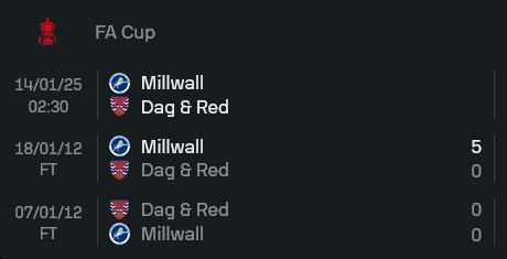 การเจอกันก่อนหน้านี้ทั้งสองครั้งเกิดขึ้นในรายการ เอฟเอ คัพ เช่นกัน โดยมิลล์วอลล์เคยถล่มดาเก้นแฮมถึง 5-0 ในปี 2012 ส่วนอีกเกมเสมอกันไปแบบไร้สกอร์ แม้ว่าจะเป็นสถิติที่ผ่านมานาน แต่ยังชี้ให้เห็นถึงความแข็งแกร่งในบ้านของมิลล์วอลล์ ทีเด็ดบอล จากการพบกันนี้คาดว่าเจ้าถิ่นยังคงเหนือกว่าทั้งในด้านขุมกำลังและประสบการณ์