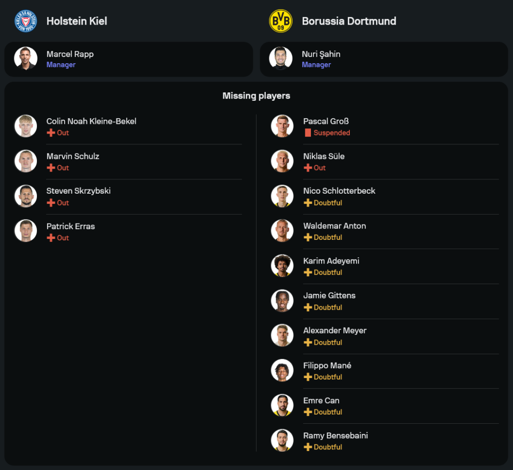 ด้าน “เสือเหลือง” ภายใต้การคุมทีมของ นูริ ชาฮิน ยังต้องขาด ปาสคาล โกรส ที่ติดโทษแบน แต่ตัวหลักอย่าง จูเลียน บรันด์ท และ เซบาสเตียน ฮัลแลร์ พร้อมลงสนาม เกมนี้จะมาในระบบ 4-2-3-1 โดยมี ฮัลแลร์ ยืนหน้าเป้าคอยล่าสกอร์