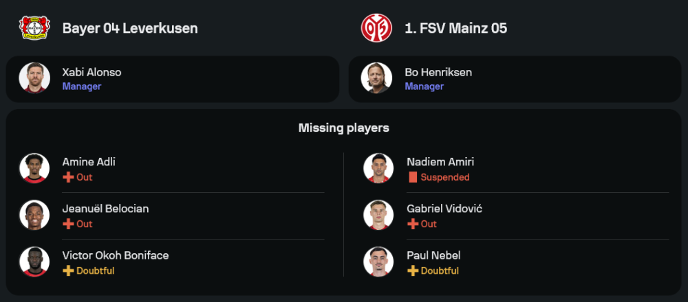 ในช่วงการพบกัน 10 นัดหลังสุด เลเวอร์คูเซ่น เป็นฝ่ายทำผลงานได้ดีกว่า โดยเอาชนะไปได้ถึง 7 นัด เสมอ 1 และแพ้เพียง 2 ครั้งเท่านั้น การเจอกันครั้งล่าสุดเมื่อวันที่ 24 กุมภาพันธ์ 2024 เลเวอร์คูเซ่นเอาชนะไปได้ 2-1 อย่างไรก็ตาม ไมนซ์ไม่ใช่ทีมที่ควรมองข้าม โดยเฉพาะในการแข่งขันที่ต้องการ ทีเด็ดบอล อย่างแท้จริง