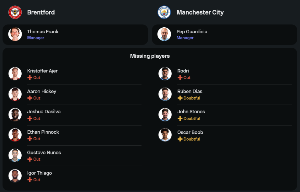 ด้านทีมเยือนอย่างแมนฯ ซิตี้ ต้องปรับตัวเช่นกันจากการขาดนักเตะคนสำคัญอย่าง รูเบน ดิอาส และ จอห์น สโตนส์ แต่ยังมีตัวเลือกคุณภาพสูงในทีม คาดว่า เป๊ป กวาร์ดิโอล่า จะส่ง ฮาลันด์ ยืนหน้าเป้า โดยมี เดอ บรอยน์, โฟเด้น, และ ซาวินโญ่ เป็นแกนหลักในเกมรุก พร้อมใช้ระบบ 4-1-4-1 เพื่อควบคุมเกม