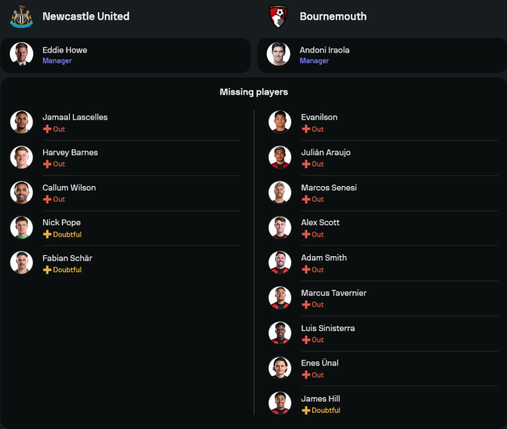 “สาลิกาดง” ของ เอ็ดดี้ ฮาว กำลังอยู่ในช่วงฟอร์มร้อนแรง พวกเขาเพิ่งจะถล่ม วูล์ฟส์ 3-0 ในลีก ทำให้คว้าชัย 5 นัดรวดทุกรายการ อย่างไรก็ตาม ความพร้อมก่อนเกมนี้จะขาด คัลลั่ม วิลสัน, ฮาร์วี่ย์ บาร์นส์, จามาล ลาสเซลล์ส และ นิค โป๊ป ที่ยังมีอาการบาดเจ็บ นอกจากนี้ ฟาเบียน แชร์ ยังต้องรอเช็คความฟิต เกมนี้ ฮาว น่าจะจัดทัพในระบบ 4-3-3 โดยใช้ อเล็กซานเดอร์ อิซัค, แอนโธนี่ กอร์ดอน และ จาค็อบ เมอร์ฟี่ เป็นสามประสานแดนหน้า