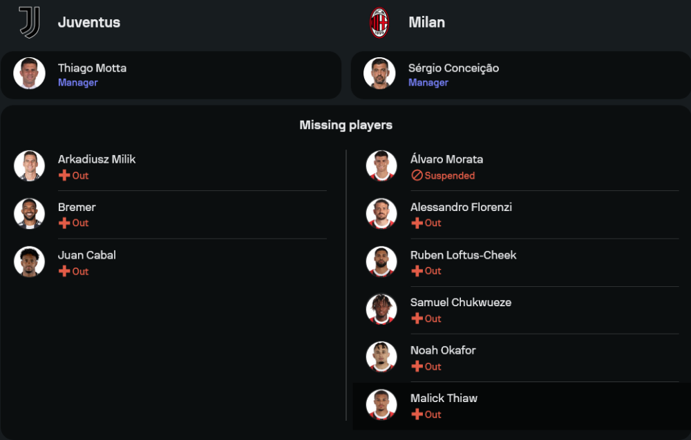ฝั่งทีมเยือนของ แซร์โจ้ คอนไซเซา มีปัญหาใหญ่ในแนวรับเมื่อ มาลิค เธียว และ อเลสซานโดร ฟลอเรนซี บาดเจ็บ รวมถึง อัลบาโร่ โมราต้า กองหน้าตัวหลักที่ติดโทษแบน แต่ยังดีที่แนวรุกอย่าง ราฟาเอล เลเอา, แท็มมี่ อบราฮัม และ อเล็กซ์ ฆิเมเนซ พร้อมล่าตาข่าย โดยมี ทิยานี่ ไรย์นเดอร์ส คอยสร้างสรรค์เกมรุก