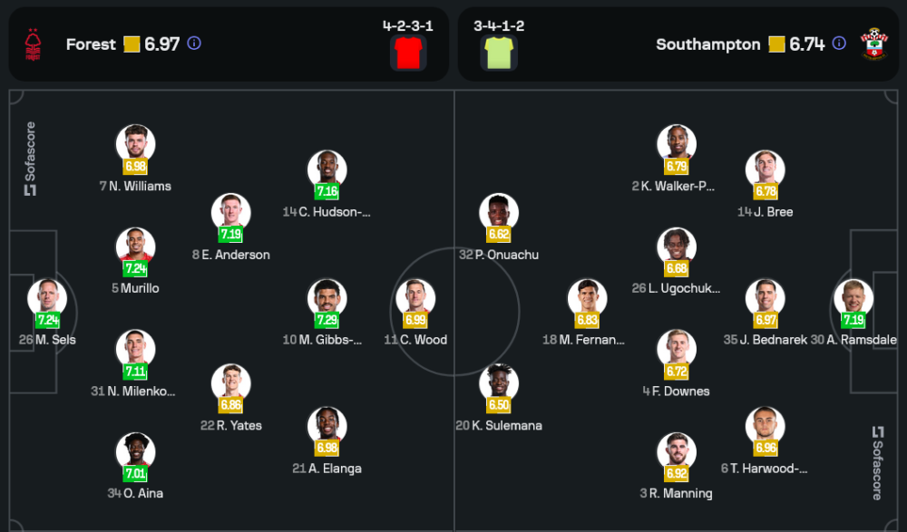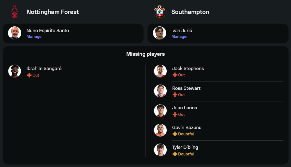 น็อตติ้งแฮม ฟอเรสต์ – กุนซือ นูโน่ เอสปิริโต้ ซานโต มีข่าวดีเมื่อไม่มีผู้เล่นบาดเจ็บเพิ่มเติม มีเพียง อิบราฮิม่า ซ็องกาเร่ กองกลางตัวสำคัญที่ยังไม่หายจากอาการบาดเจ็บ อย่างไรก็ตาม แกนหลักรายอื่นยังคงฟิตพร้อม คาดว่า ฟอเรสต์ จะมาในระบบ 4-2-3-1 โดยมี คริส วู้ด เป็นกองหน้าตัวเป้า พร้อมด้วยสามตัวรุก แอนโธนี่ อีลังก้า, มอร์แกน กิ๊บบ์ส-ไวท์ และ คัลลั่ม ฮัดสัน-โอดอย คอยปั้นเกมจากด้านหลัง