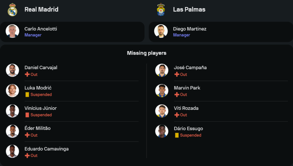 คาร์โล อันเชล็อตติ จะต้องเผชิญกับปัญหานักเตะติดโทษแบนอย่าง ลูก้า โมดริช และ วินิซิอุส จูเนียร์ ขณะที่ เอแดร์ มิลิเตา และ ดานี่ การ์บาฆาล ยังไม่หายจากอาการบาดเจ็บ ส่วน เอดูอาร์โด้ กามาวินก้า ก็ต้องพักฟื้นต่อไป คาดว่าเกมนี้จะส่ง คีลิยัน เอ็มบัปเป้ ลงล่าตาข่าย โดยมี จู๊ด เบลลิงแฮม กับ โรดรีโก้ เป็นตัวปั้นเกมรุก