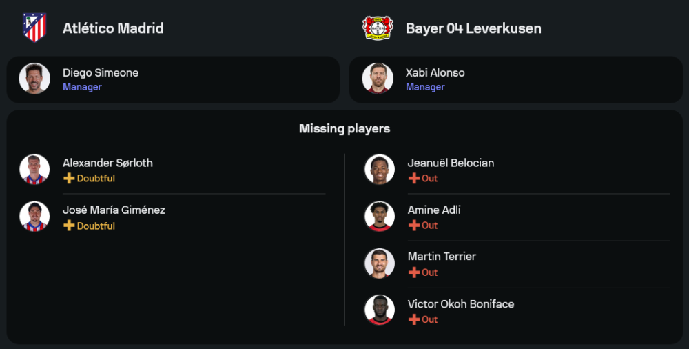 แอตเลติโก มาดริด เจ้าบ้านภายใต้การคุมทีมของดีเอโก้ ซิเมโอเน่ ต้องการเรียกฟอร์มกลับมา หลังจากสะดุดแพ้ในเกมลีกล่าสุดที่เจอกับเลกาเนส อย่างไรก็ตาม สภาพทีมถือว่าสมบูรณ์เกือบ 100% มีเพียง โฆเซ่ มาเรีย กิมิเนซ แนวรับคนสำคัญที่ยังต้องรอเช็กความฟิต การจัดทัพในวันนี้ ซิเมโอเน่คงใช้ระบบ 4-4-2 โดยมี อองตวน กรีซมันน์ และ ฆูเลี่ยน อัลบาเรซ เป็นตัวความหวังในแดนหน้า