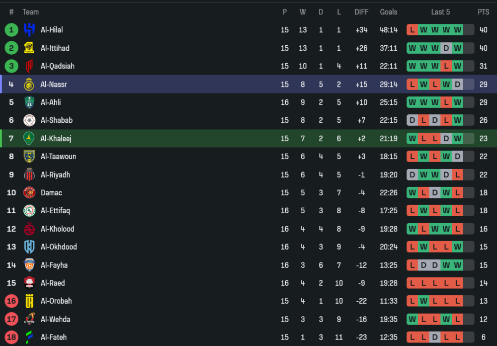 ผลงานในลีกช่วงหลังถือว่ากำลังดี พวกเขาชนะ 3 จาก 5 เกมหลังสุด โดยเฉพาะนัดล่าสุดที่ไล่ถล่ม อัล-โอรูบาห์ ไป 3-0 ทำให้พวกเขาขยับขึ้นมาอยู่ในอันดับ 7 ของตารางและมีลุ้นเบียดขึ้นไปลุ้นพื้นที่ท็อปไฟว์
