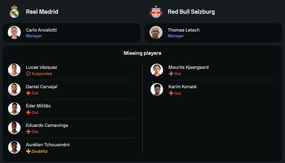 ทีมของ คาร์โล อันเชล็อตติ ต้องเผชิญกับปัญหาผู้เล่นบาดเจ็บหลายราย รวมถึง ดานี่ การ์บาฆาล, เอแดร์ มิลิเตา และ เอดูอาร์โด้ คามาวิงก้า ที่ไม่พร้อมลงสนาม ขณะที่ ออเรเลียง ชูอาเมนี่ ยังต้องรอเช็กความฟิต นอกจากนี้ ลูคัส บาซเกซ ยังติดโทษแบน แต่ข่าวดีคือ วินิซิอุส จูเนียร์ และ ลูก้า โมดริช พร้อมกลับมาช่วยทีม