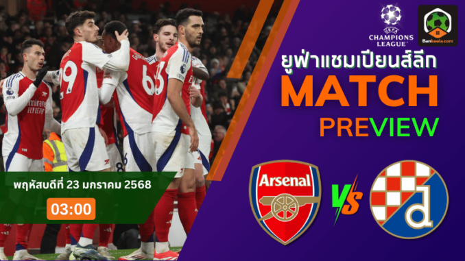 ศึก ยูฟ่า แชมเปียนส์ลีก 2024 คืนวันพฤหัสบดีที่ 23 มกราคม 2568 เวลา 03.00 น. ตาม ตารางบอลวันนี้ “ไอ้ปืนใหญ่” อาร์เซน่อล เตรียมเปิดรัง เอมิเรตส์ สเตเดี้ยม รับมือ ดินาโม ซาเกร็บ ทีมดังจากโครเอเชีย โดยเจ้าถิ่นภายใต้การนำของ มิเกล อาร์เตต้า หวังใช้เกมนี้เรียกฟอร์มเก่งหลังจากที่สะดุดมาหลายนัด ในขณะที่ทีมเยือนที่มี ฟาบิโอ คันนาวาโร่ คุมทัพ ก็ตั้งเป้ามาเล่นแบบรัดกุม หวังแบ่งแต้มกลับบ้านให้ได้ ศึกนี้เดือดแน่นอน!