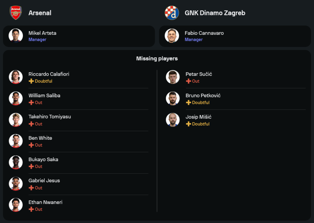 ฝั่ง เจ้าบ้าน ต้องพบกับปัญหาผู้เล่นบาดเจ็บมากมาย โดยจะไม่มี เบ็น ไวท์, วิลเลี่ยม ซาลิบา, บูกาโย่ ซาก้า และ กาเบรียล เฆซุส ที่พลาดลงสนามแน่นอน รวมถึง ริคคาร์โด้ คาลาฟิออรี่ ที่ต้องรอเช็คความฟิต อย่างไรก็ตาม ยังมีข่าวดีคือ มาร์ติน โอเดการ์ด และ ไค ฮาแวร์ตซ์ พร้อมลงปั้นเกมรุก โดยมี กาเบรียล มาร์ติเนลลี่ และ เลอันโดร ทรอสซาร์ คอยสนับสนุนแดนหน้า