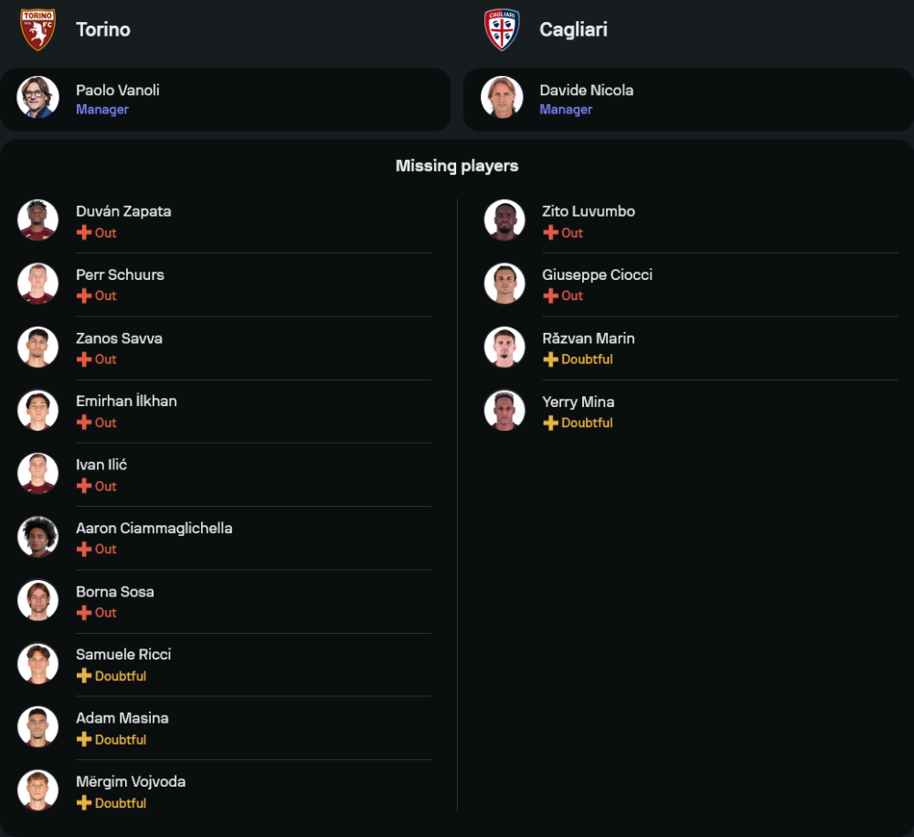 โตริโน่แม้จะได้เล่นในบ้าน แต่แนวรุกยังไม่เฉียบคมพอ ขณะที่ กาญารี่ ฟอร์มกำลังมาแรงและมีความมั่นใจสูง เกมนี้มีโอกาสออกเสมอ หรือทีมเยือนอาจมีทีเด็ดคว้าชัย