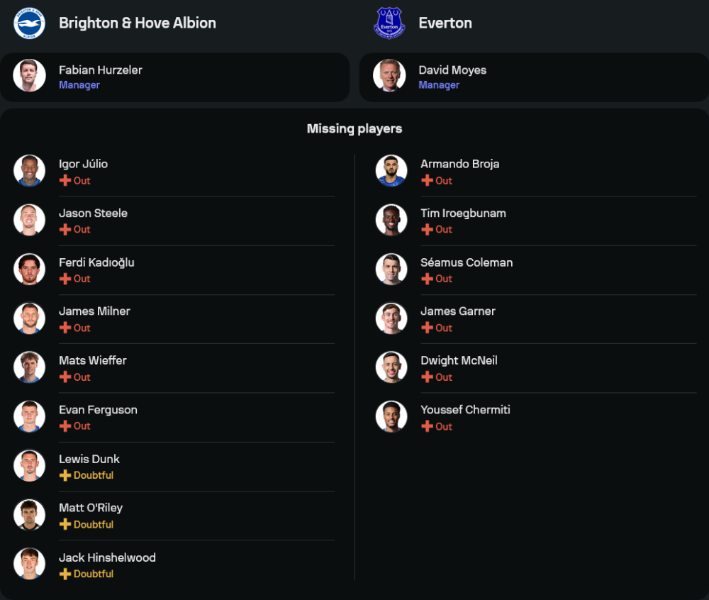 เจ้าถิ่นภายใต้การคุมทีมของ ฟาเบียน ฮูร์เซเลอร์ กำลังอยู่ในช่วงฟอร์มร้อนแรง หลังจากคว้าชัย 3 นัดติดรวมทุกรายการ อย่างไรก็ตาม พวกเขามีปัญหานักเตะบาดเจ็บหลายราย ไม่ว่าจะเป็น อิกอร์ ฮูลิโอ, เจมส์ มิลเนอร์, เฟร์ดี้ คาดิโอกลู, แม็ตส์ วีฟเฟอร์ และ บรายาน กรูด้า ที่ยังต้องพักรักษาตัว นอกจากนี้ยังมี ลูอิส ดังค์, แมตต์ โอไรลีย์ และ แจ็ค ฮินเชลวูด ที่ต้องรอเช็กความฟิต เกมนี้แนวรุกฝากความหวังไว้ที่ แดนนี่ เวลเบ็ค และ เชา เปโดร ที่กำลังเล่นได้อย่างยอดเยี่ยม