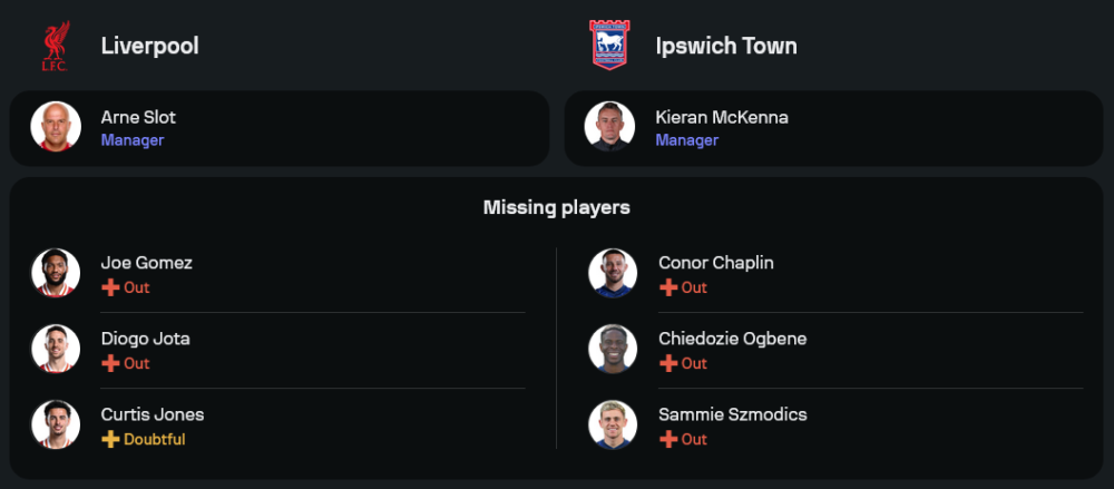 อิปสวิช ภายใต้การนำของ คีแรน แม็กเคนน่า เพิ่งพ่ายให้กับ แมนเชสเตอร์ ซิตี้ 0-6 ในเกมล่าสุด ซึ่งเป็นสัญญาณชัดเจนว่าพวกเขาต้องพัฒนาเกมรับอย่างเร่งด่วน นอกจากนั้น ทีมยังมีปัญหาผู้เล่นบาดเจ็บ โดยจะไม่มี คอเนอร์ แชปลิน, ชีโดซี่ อ๊กเบเน่ และ ซามูเอล ซีโมดิกส์ ที่ต้องพักยาว คาดว่า แม็กเคนน่า จะใช้แผน 5-4-1 ตั้งรับแน่นหนา พร้อมใช้ เลียม ดีแล็ป เป็นตัวทีเด็ดในแดนหน้า