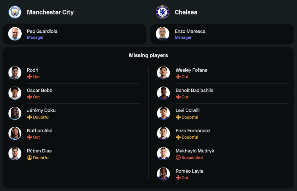 เชลซีภายใต้การคุมทีมของ เอนโซ่ มาเรสก้า กำลังหาฟอร์มที่คงเส้นคงวา เกมนี้จะไม่มี เวสลี่ย์ โฟฟาน่า, เบอนัวต์ บาเดียชิล และ โรเมโอ ลาเวีย ส่วน เลวี่ โคลวิลล์ และ เอ็นโซ่ เฟร์นานเดซ ยังต้องรอเช็กฟิต ขณะที่ มีไคโล มูดริค ติดโทษแบน อย่างไรก็ตาม พวกเขายังมี โคล พาลเมอร์, นิโคลัส แจ็คสัน และ รีซ เจมส์ เป็นตัวความหวังในระบบ 4-2-3-1