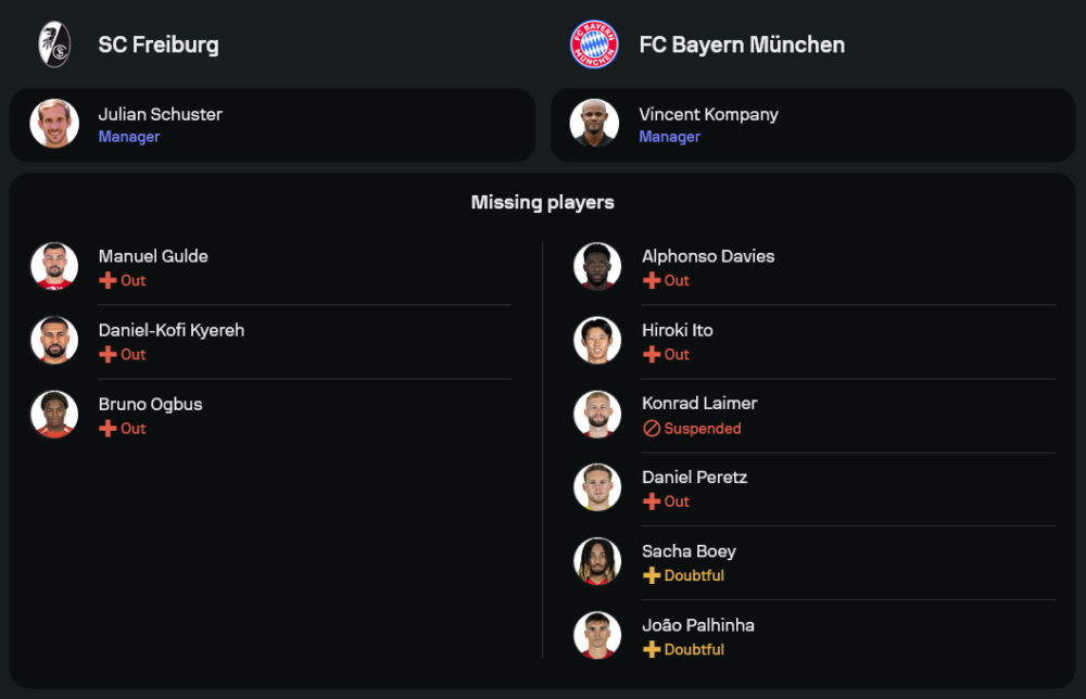 “เสือใต้” เพิ่งสะดุดในเกมยุโรปหลังพ่ายให้กับ เฟเยนูร์ด 0-3 อย่างไรก็ตาม พวกเขาจะกลับมาเน้นเต็มที่ในเกมลีก โดยกุนซือ แว็งซ็อง ก็อมปานี ต้องขาด อัลฟองโซ่ เดวี่ส์, ฮิโรกิ อิโตะ และ คอนราด ไลเมอร์ ที่ติดโทษแบน แต่ยังคงมีแนวรุกสุดอันตรายอย่าง เลรอย ซาเน่, ยามาล มูเซียล่า และ แฮร์รี่ เคน ที่พร้อมปิดบัญชีเจ้าถิ่น