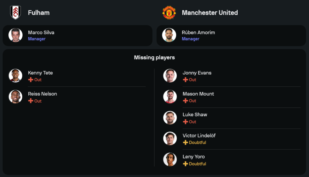 สภาพทีมยังคงมีนักเตะบาดเจ็บหลายราย ลุค ชอว์, เมสัน เมาท์ และ จอนนี่ อีแวนส์ ลงเล่นไม่ได้แน่นอน ส่วน วิคเตอร์ ลินเดอเลิฟ และ เลนี่ โยโร ยังต้องรอเช็คความฟิต คาดว่าพวกเขาจะมาในระบบ 3-4-2-1 โดยมี ราสมุส ฮอยลุนด์ ยืนหน้าเป้า พร้อมได้ บรูโน่ แฟร์นานเดส และ อาหมัด ดิยัลโล่ คอยสนับสนุนเกมรุก