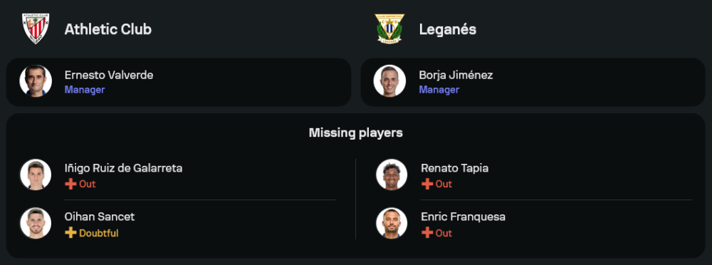 ทีมของ เอร์เนสโต้ บัลเบร์เด้ กำลังต้องการแต้มสำคัญในการลุ้นพื้นที่ยุโรป แต่ข่าวร้ายคือ อินญิโก้ รุยซ์ เด กาลาร์เรต้า มิดฟิลด์ตัวหลักยังบาดเจ็บ ส่วน โอยาน ซานเซต ยังต้องเช็กความฟิตก่อนเกม แนวรุกต้องฝากความหวังไว้ที่ อินญากี้ วิลเลียมส์ และ นิโก้ วิลเลียมส์ คู่พี่น้องที่เป็นหัวใจสำคัญของทีมในฤดูกาลนี้
